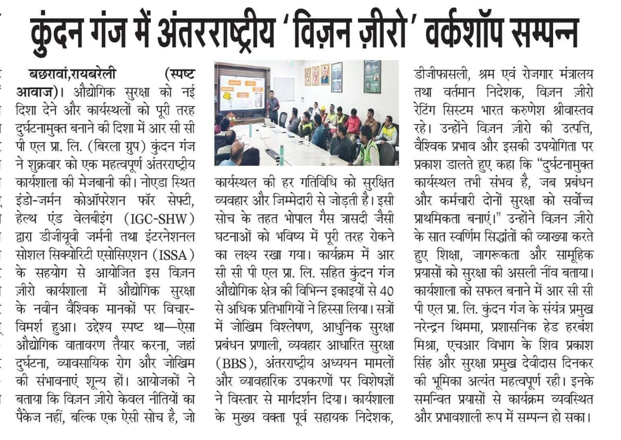 On 15th November 2025, the IGC-SHW organised 6th workshop on ‘Vision Zero Approach for Occupational Safety, Health and Wellbeing’ at RCCPL Pvt. Ltd. (MP Birla group), Raebareli (UP).