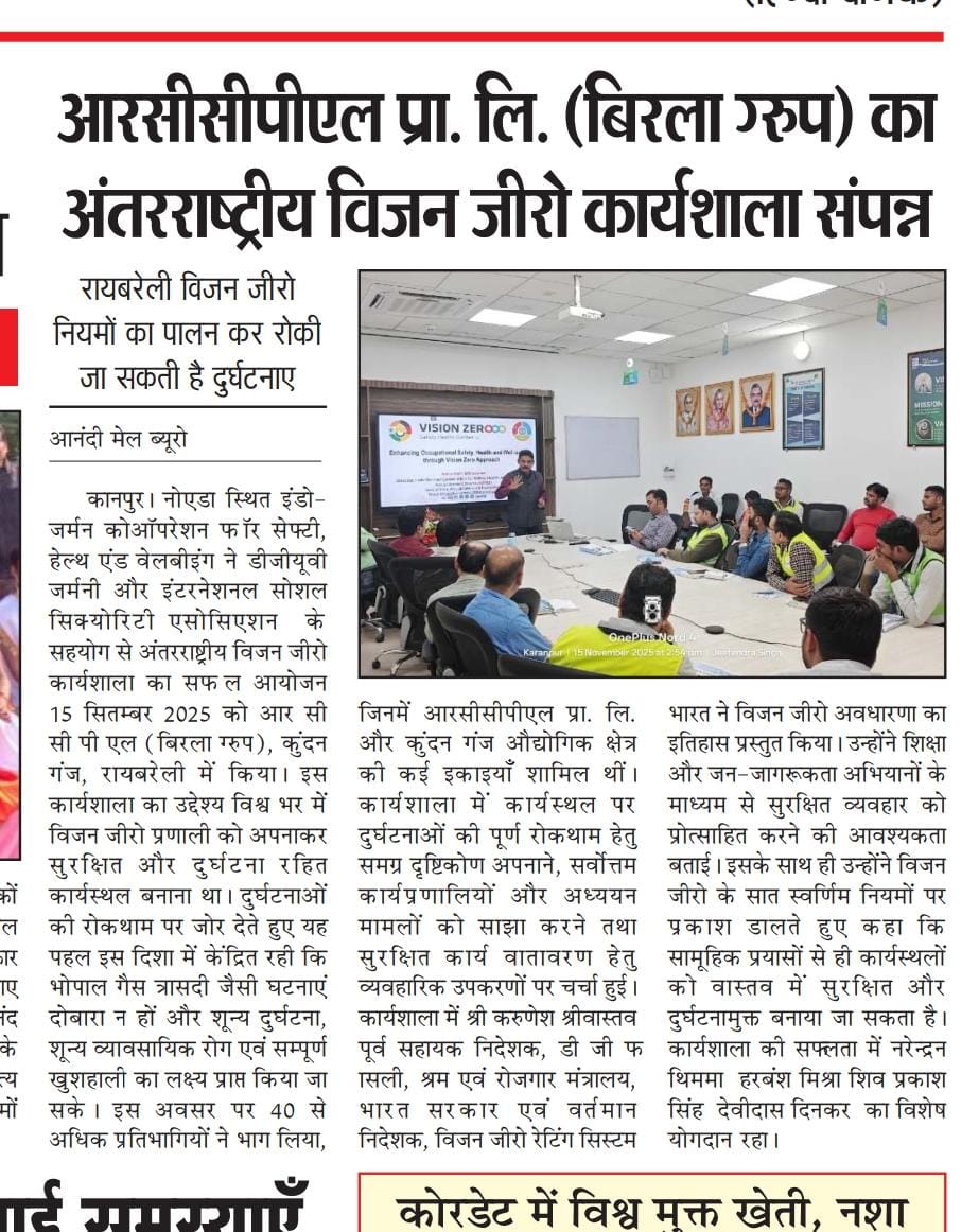 On 15th November 2025, the IGC-SHW organised 6th workshop on ‘Vision Zero Approach for Occupational Safety, Health and Wellbeing’ at RCCPL Pvt. Ltd. (MP Birla group), Raebareli (UP).